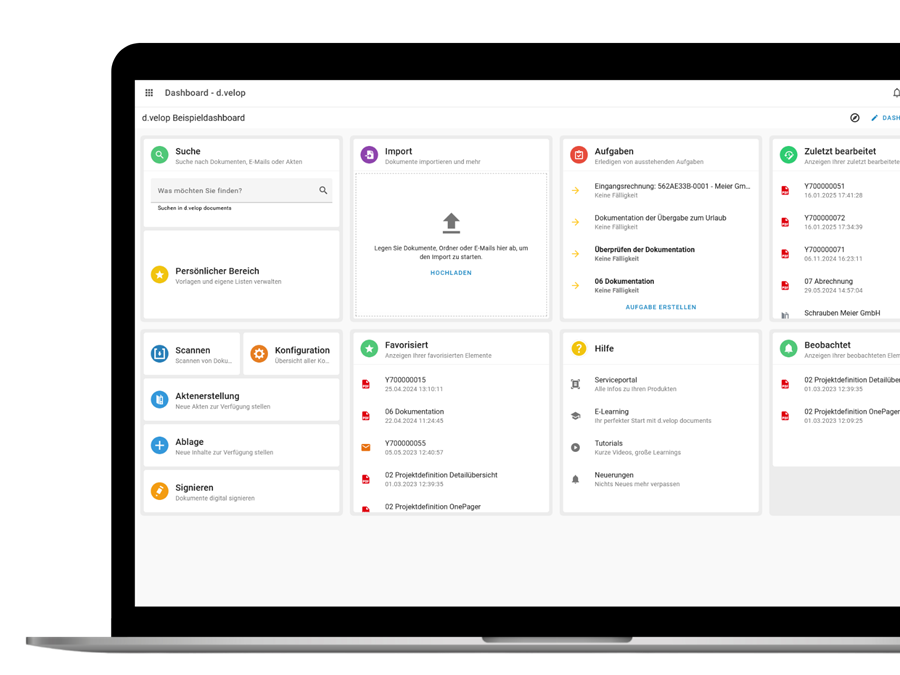 Papierordner, verstreute Dateien und unklare Ablagen kosten Zeit und Nerven. Mit d.velop documents gehören diese Probleme der Vergangenheit an: Ihre Unterlagen sind zentral gespeichert, sicher archiviert, blitzschnell auffindbar und immer auf dem neuesten Stand.